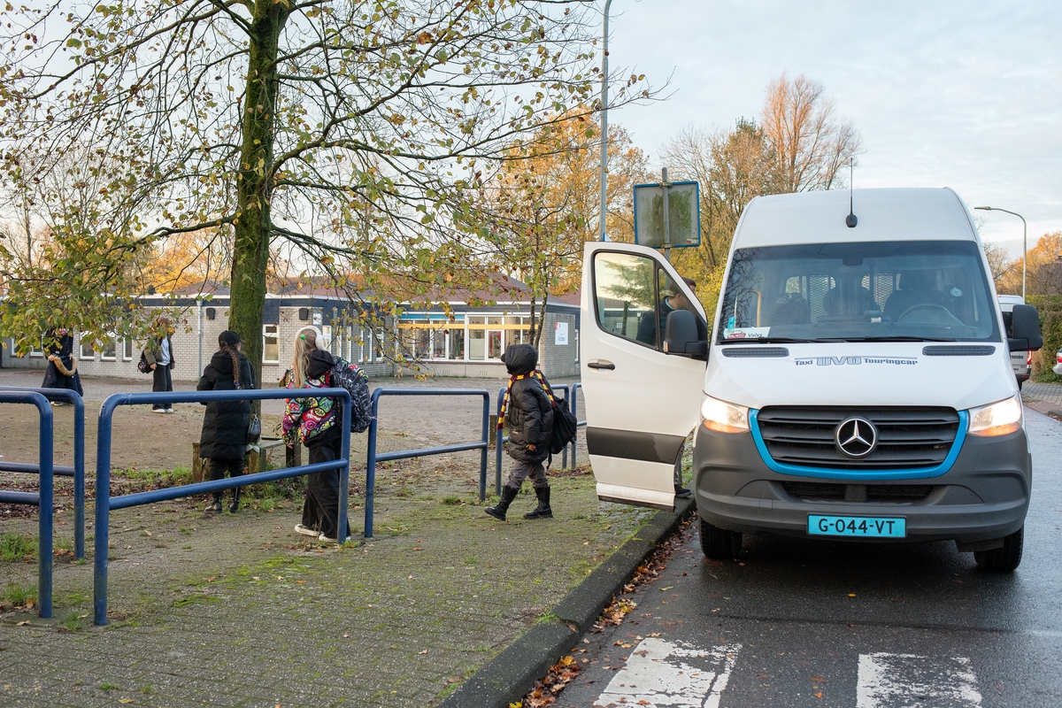 Kinderen komen met de taxi. De school vraagt dit aan bij de gemeente. Ouders horen wanneer hun kind vertrekt en thuiskomt